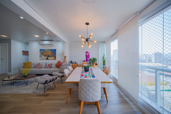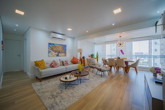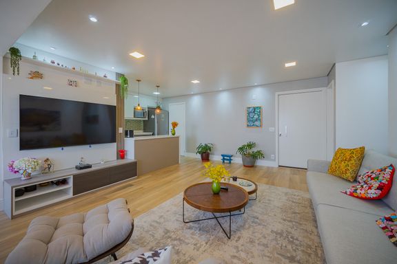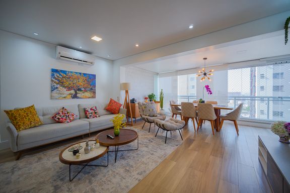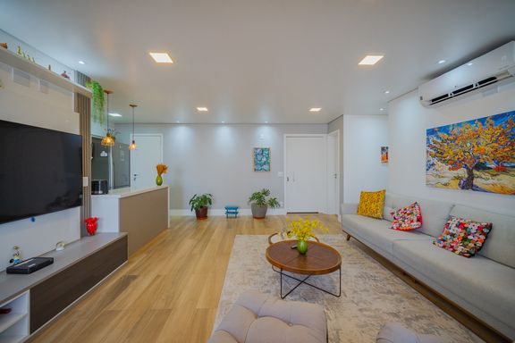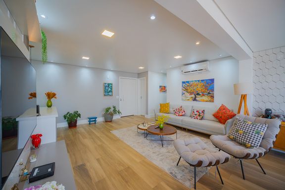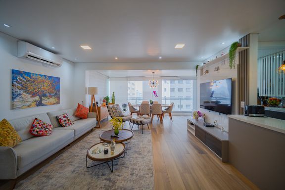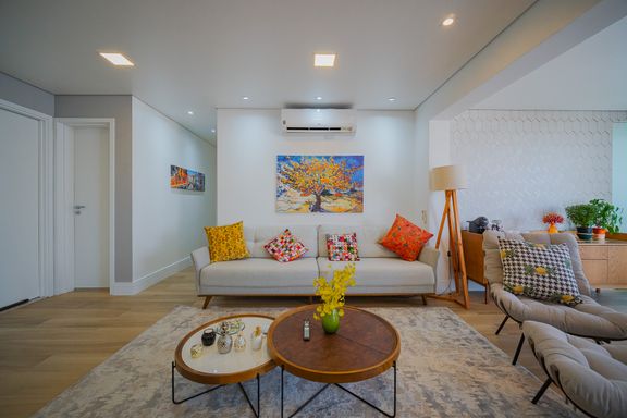Sala de estar com living ampliado, iluminada naturalmente e equipada com ar-condicionado, proporcionando conforto térmico em qualquer estação