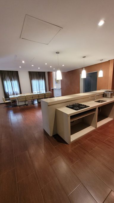 Salão de Festas amplo e muito bem equipado, com mesas, cadeiras, bancada e cozinha industrial