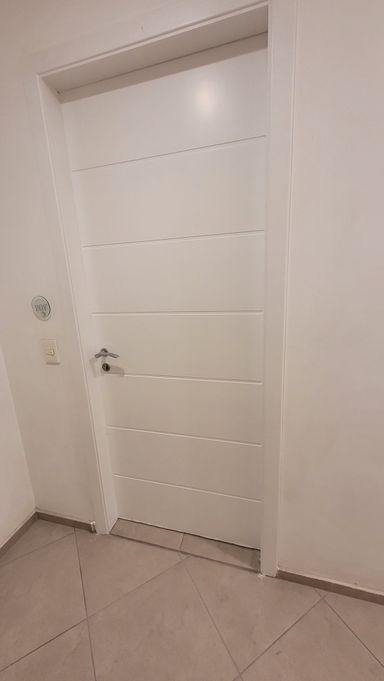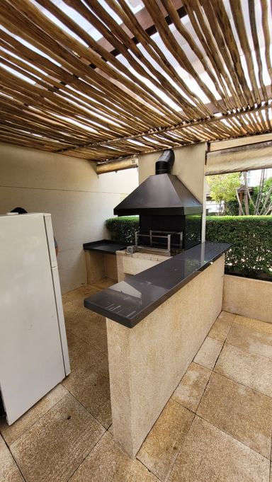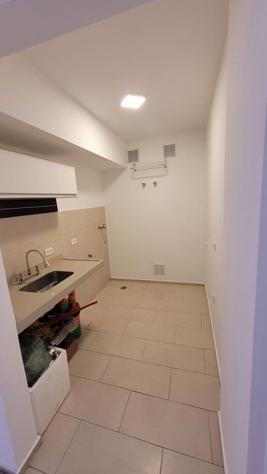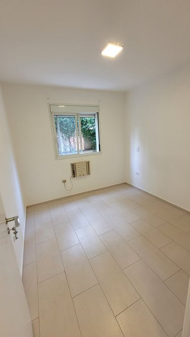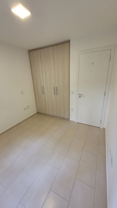 O quarto conta com armário e ar-condicionado, trazendo praticidade e conforto. Na cozinha e no banheiro, há água quente, garantindo mais comodidade no dia a dia.